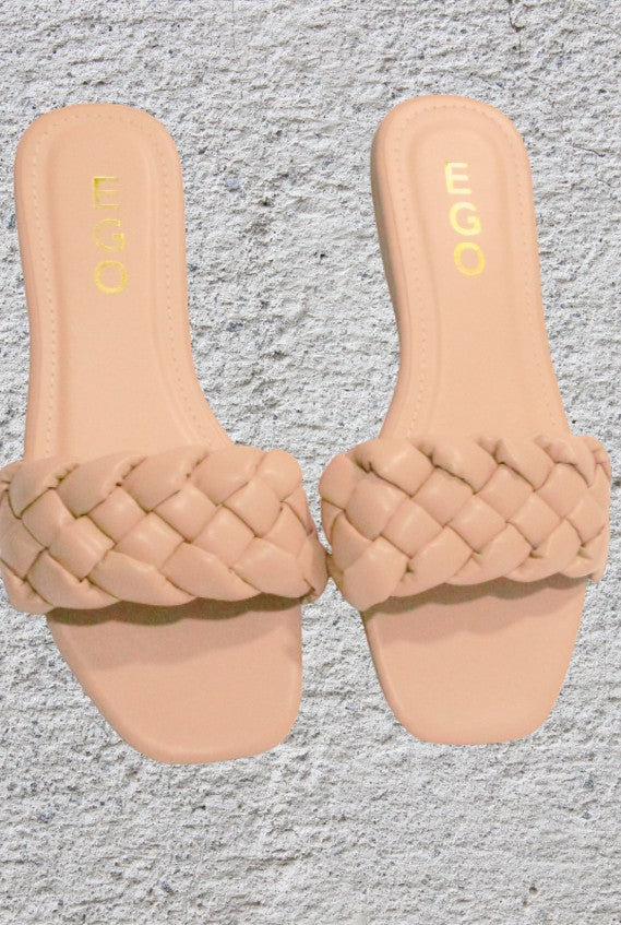 Intertwined slip on flat sandal, slides. Step out in effortless style with these chic woven strap flat sandals. Crafted from soft, supple faux leather in a versatile nude hue, these slides offer a comfortable and fashionable choice for any casual occasion. The intricate woven detail on the strap adds a touch of texture and sophistication, making them a perfect pairing for everything from sundresses to denim. Enjoy all-day comfort and a polished look with these must-have summer sandals.